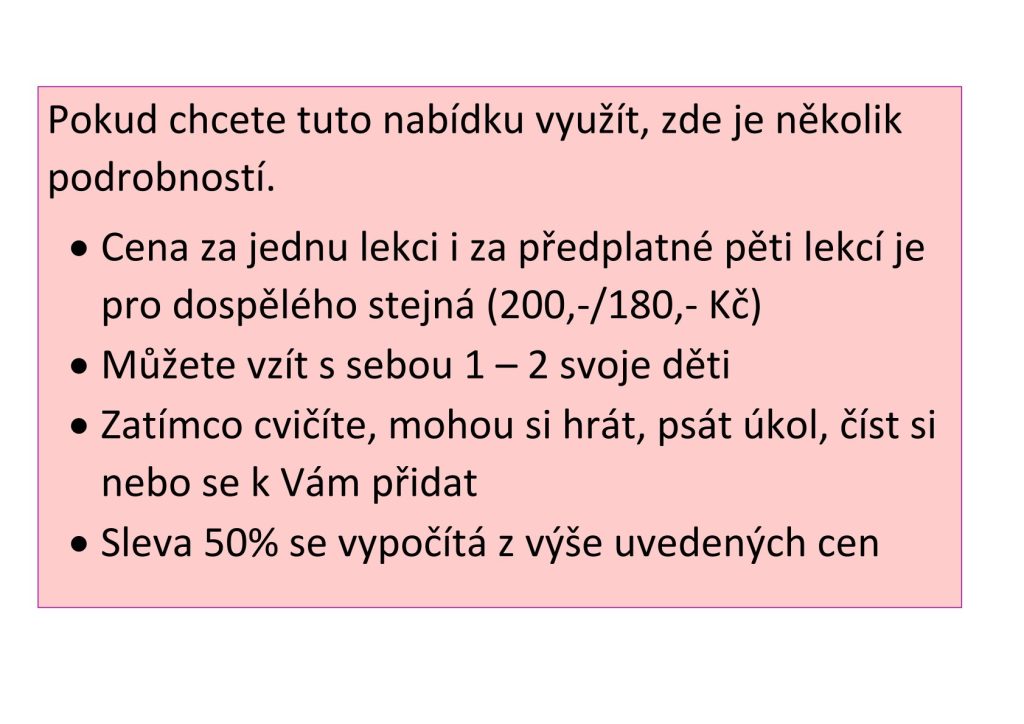 – Klikněte na ZUMBA kurz, pokud chcete rezervovat 5 lekcí v řadě a získat tak slevu 10%. U každého kurzu je uvedeno období, které si rezervujete, celkem 5 lekcí. Po potvrzení tlačítka „celý kurz“ zvolíte způsob platby (převod nebo osobně) a máte hotovo!